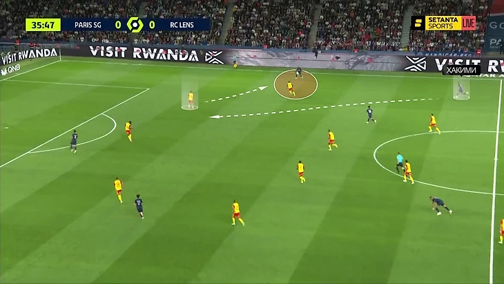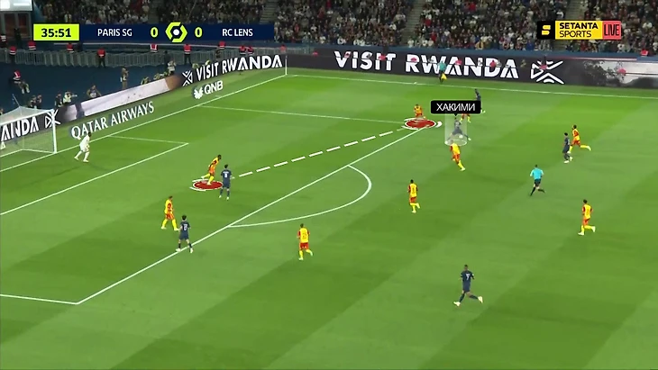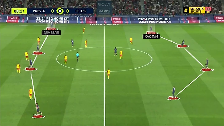 Матч против «Ланса» – их первый совместный старт. Он показал и некоторые проблемы, и потенциал. В стадии продвижения «ПСЖ» использовал структуру 4-2-4 – почти без центра. Хакими оставался рядом с защитниками, Дембеле давал ширину справа: