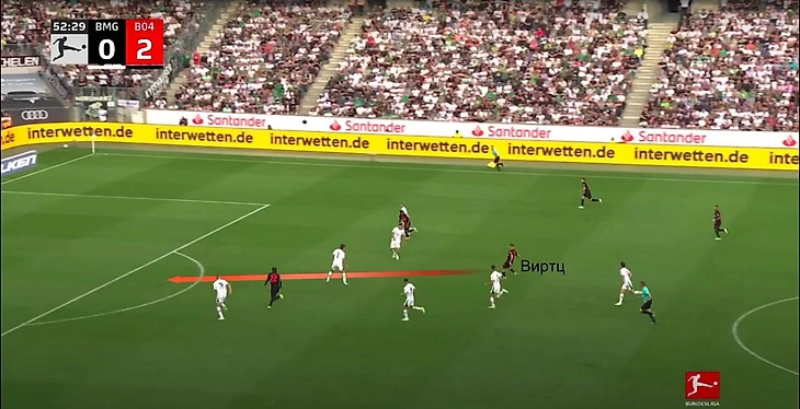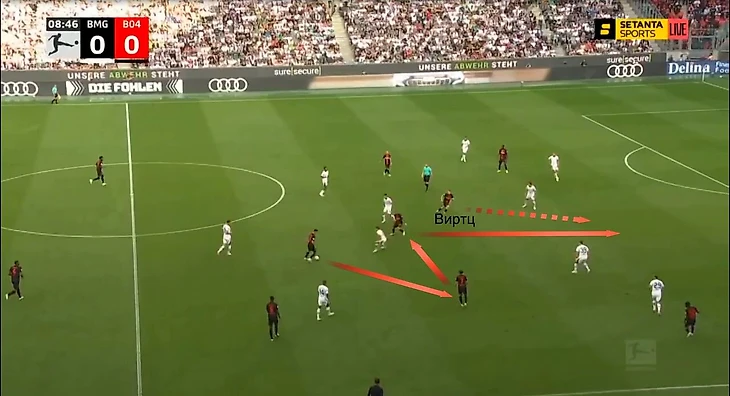 Вот пример: «Байер» в позиционной атаке нарисовал ромб, за счет которого вскрыл позиционную защиту «Гладбаха». Виртц затем простреливал на Бонифасе, который здесь пробил рядом со штангой.
