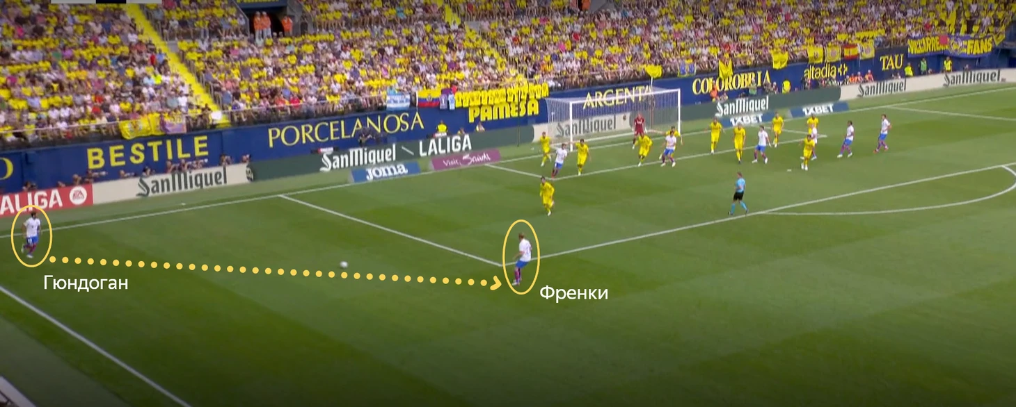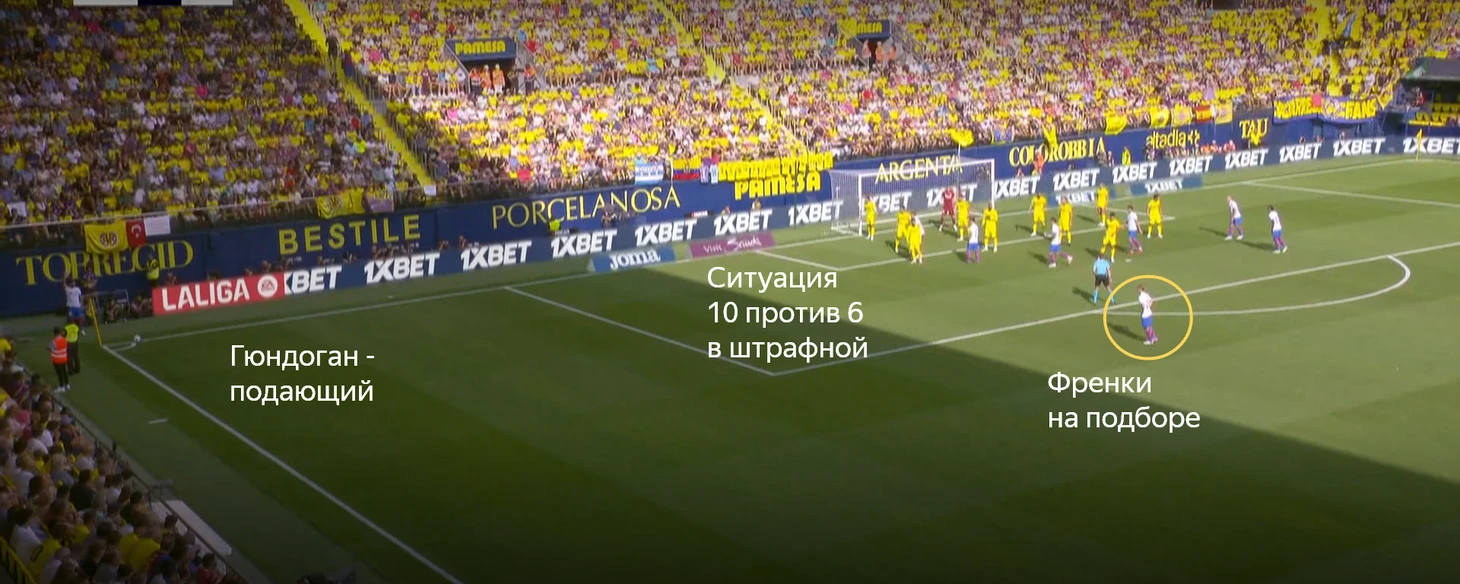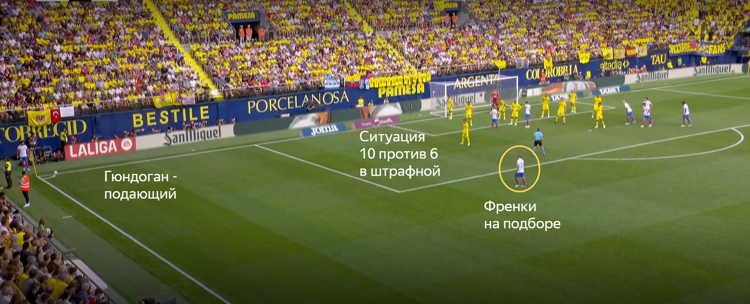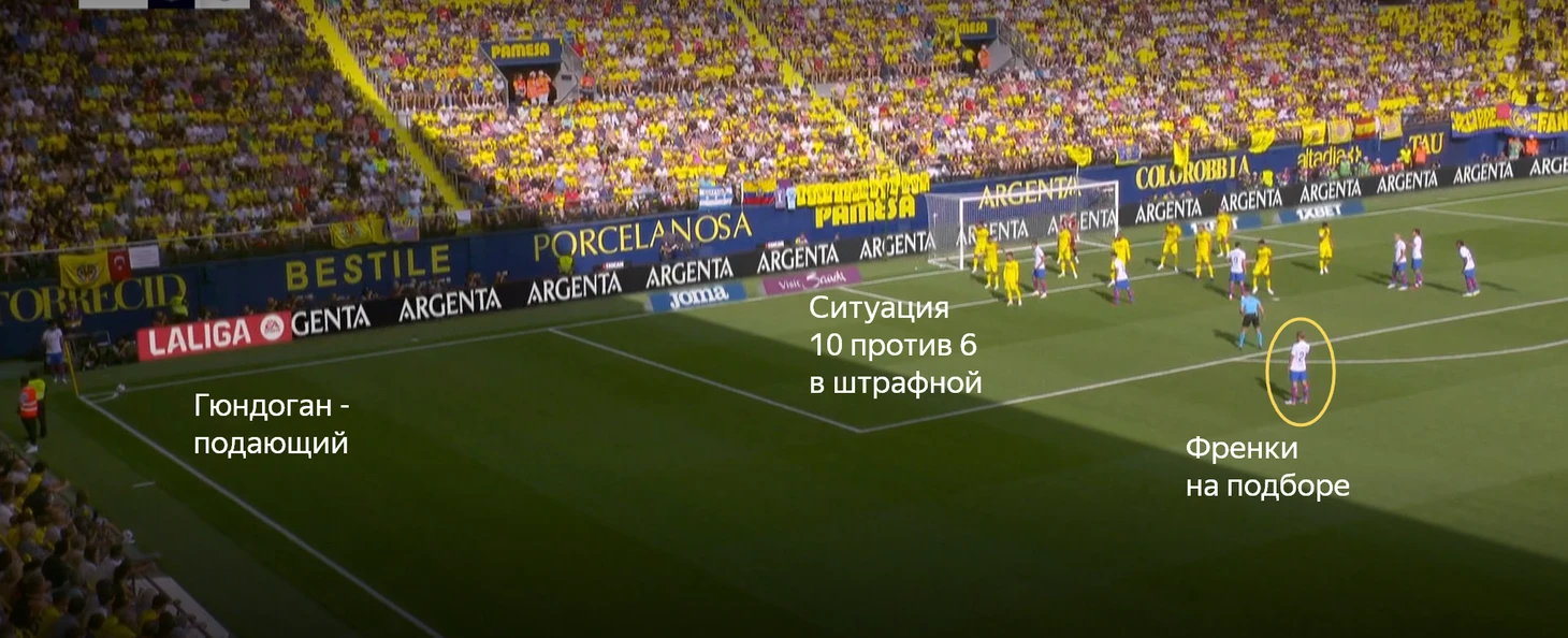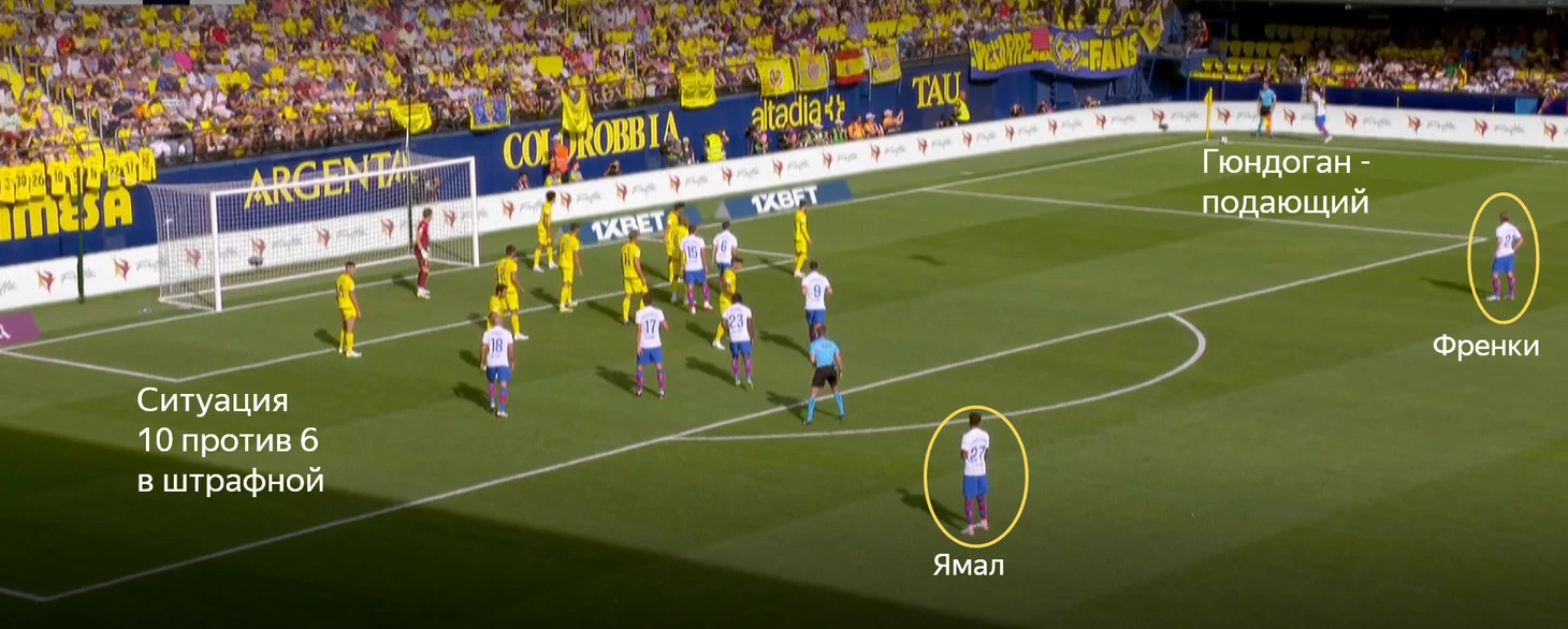 Но абсолютно свободными в зоне подбора оставались Френки (ближний участок) и Ямал (дальний). Серджи Роберто был страхующим. За подачи отвечал Гюндоган.
