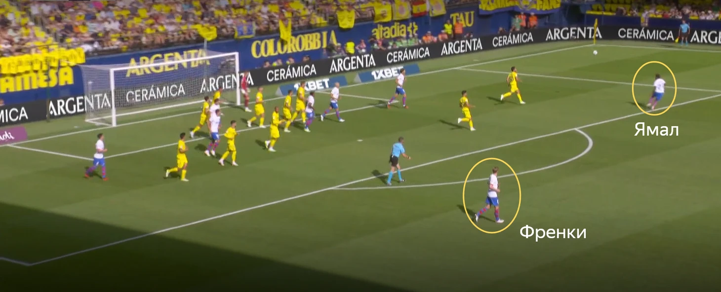 Френки и Ямал остаются свободными на подборе перед штрафной. Де Йонг на участке ближе к подающему. Ламин в дальней зоне.
