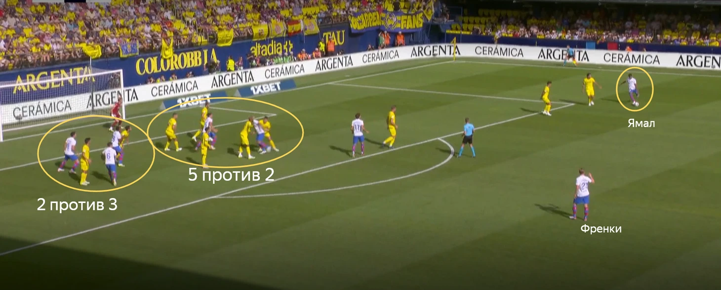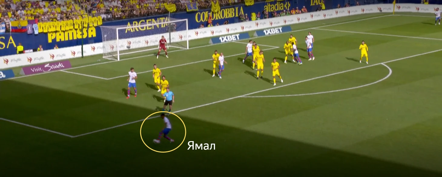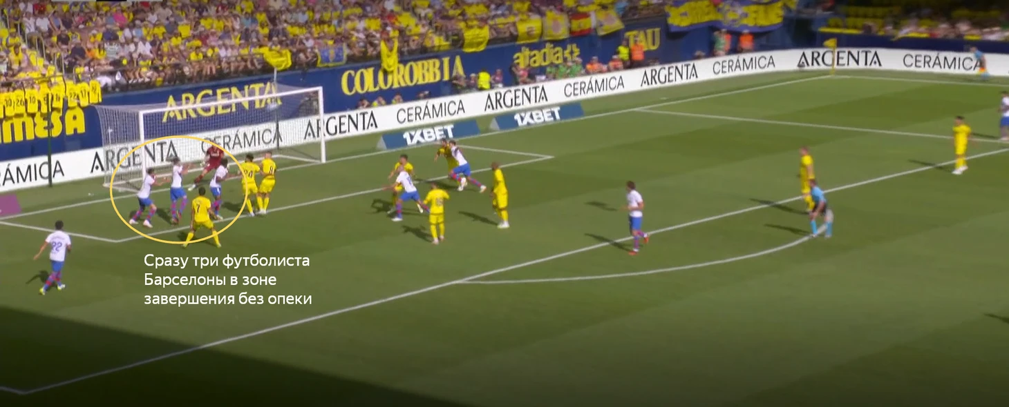 Здесь есть вопросы к действиям игроков «Вильярреала» при обороне. Во-первых, два футболиста никак не накрывают Ямала, позволяют ему спокойно готовить передачу. Во-вторых, странное расположение в штрафной. На одном участке (ближнем) 5 игроков накрывает двух футболистов «Барселоны», но на дальней штанге против трёх футболистов «Барсы» остаётся только пара защитников.