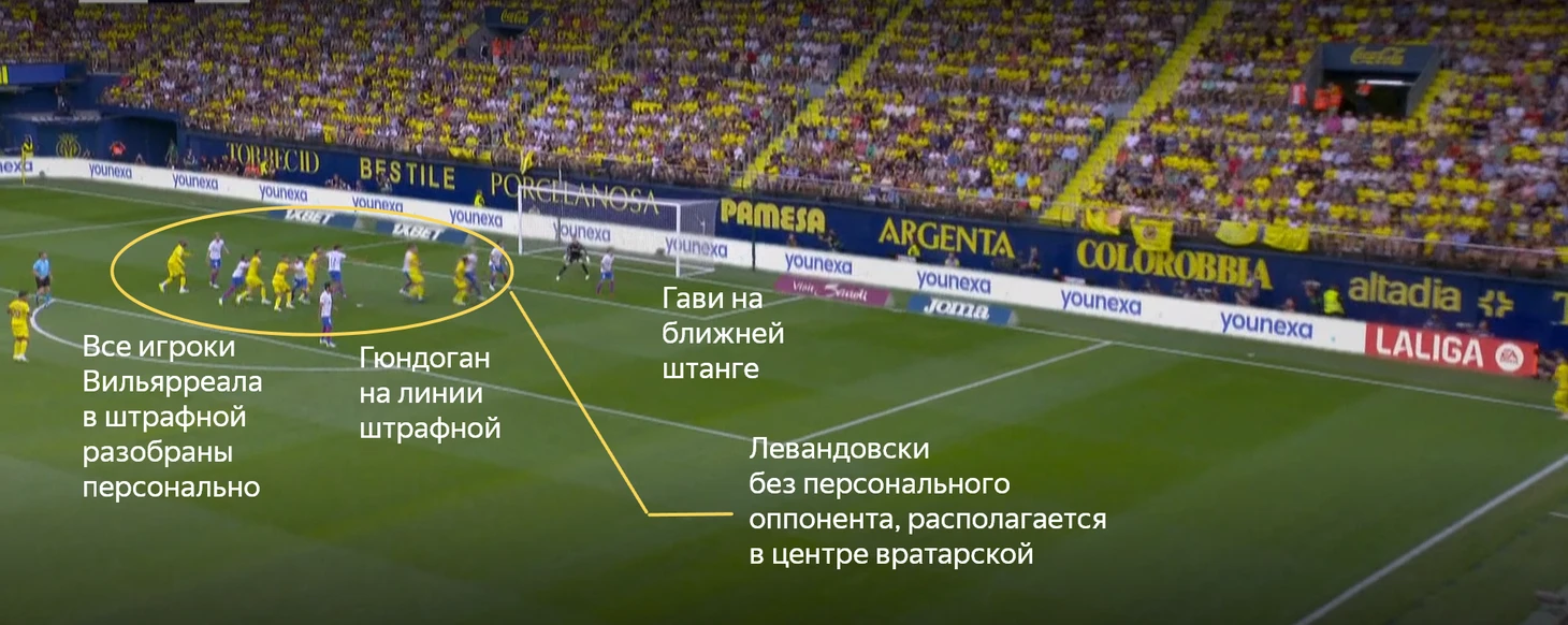 Чаще всего Гави и Кристенсен располагались на ближней штанге. Левандовски был в центре (между вратарской и точкой пенальти). За спиной поляка находились Алонсо и Ромеу. Кунде обычно стартовал в самой дальней позиции и набегал в момент подачи. Понятно, что эпизодически позиции могли меняться. Даже по ходу одного эпизода. Но чаще всего расположение было именно таким.