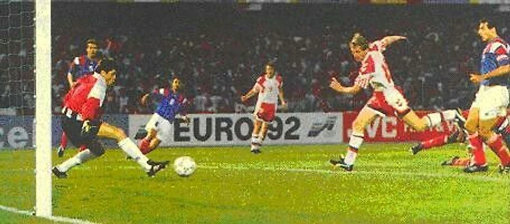 Очередная «папенада» в матче Бельгия-Франция, 25 марта 1992. Фантастический по исполнению удар Жан-Пьера позволил трехцветным сравнять счет и уйти от поражения