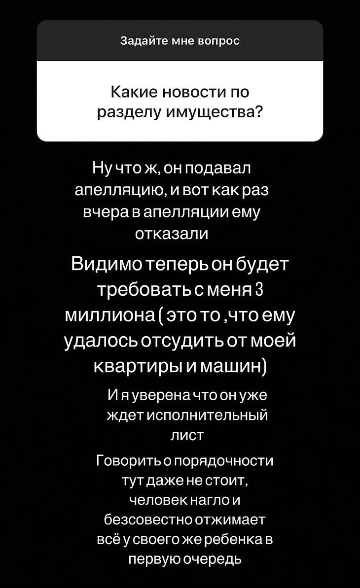Девушка ответила, что суд отказал Мамаеву во взыскании с нее 33 млн рублей, и теперь он пытается получить 3 млн.