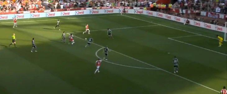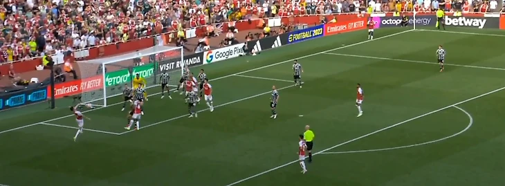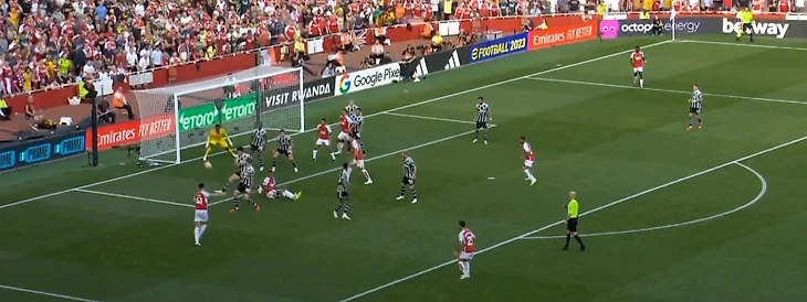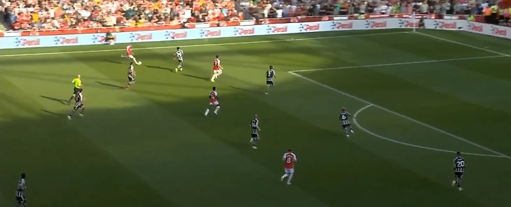 Тем временем в центре штрафной видя движения Нкетиа-Мартинез выдвегается за ним, а Эриксен который позиционно закрывал возможную атаку вторым темпом «Арсенала» видя пустую зону перед собой смещается на место Мартинеза и оставляя на ударной позиции Эдегора одного перед штрафной. Далот прикрывает Сака на фланге.