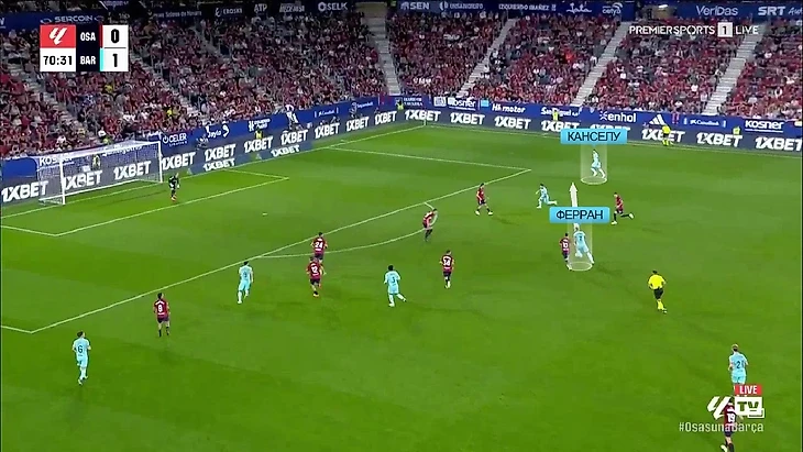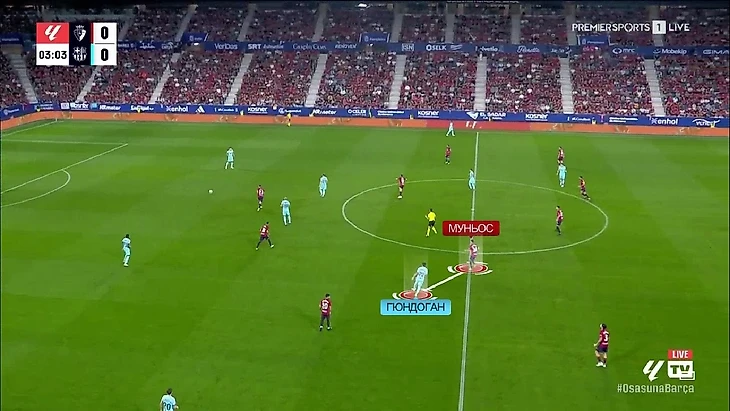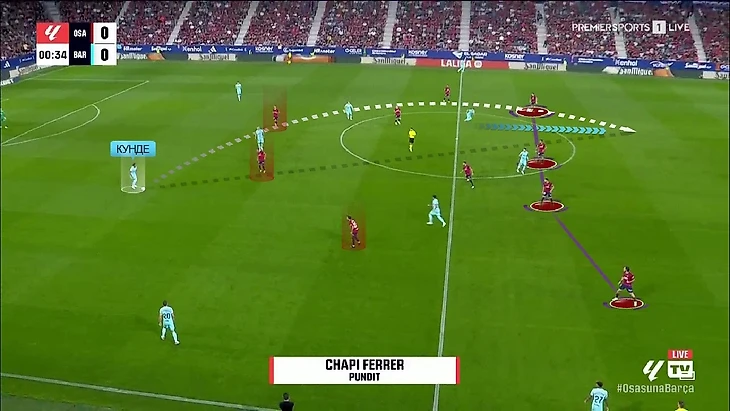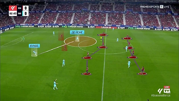 При этом команда не стремилась садиться сразу в низкий блок – поддерживалась высота оборонительной линии. Правда, это «Осасуне» аукнулось уже на первой минуте: высокая линия есть, но давление на защитников «Барсы» отсутствует – Кунде этим пользуется и делает классный заброс не забегающего Гави: