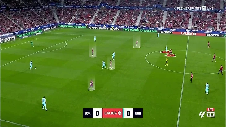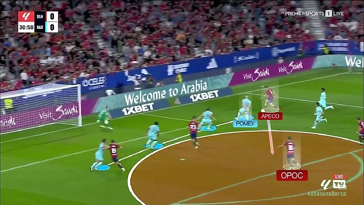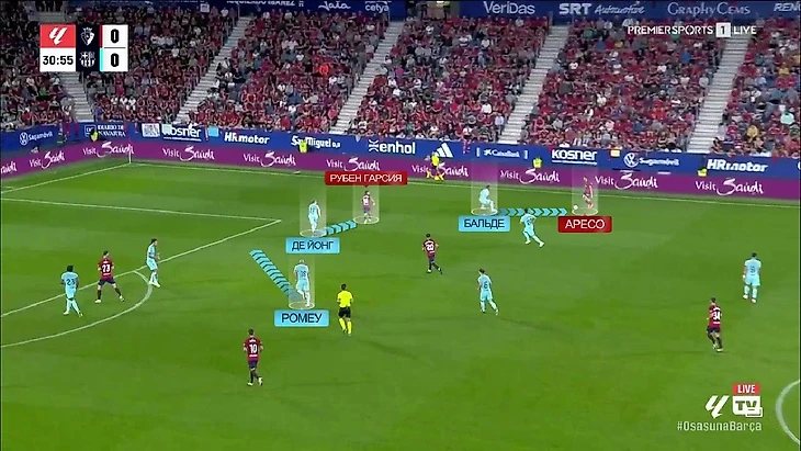 Иногда имели место индивидуальные недоработки. Так, например, пришёл единственный явный голевой момент «Осасуны». Всё завязалось на левом фланге «Барселоны»: Бальде выходит из линии на Хесуса Аресо, Рубен Гарсия открывается под передачу во фланг и за ним следует де Йонг, а Ориоль Ромеу страхует Френки и опускается в зону, из которой на Гарсию голландец выходил:
