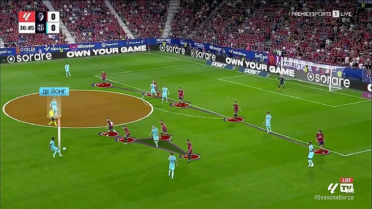 Момент с забросом на Левандовского, который привёл к пенальти, пришёл из другой ситуации. Френки де Йонг стал играть чуть глубже, но как мы уже с вами выяснили, в первой стадии владения «Барсы» хозяева не оказывали давление. Что мы видим в этой ситуации: «Осасуна» достаточно глубоко располагается, но всё равно поддерживает высоту линии, а на Френки де Йонга с мячом вообще не оказывается давления: