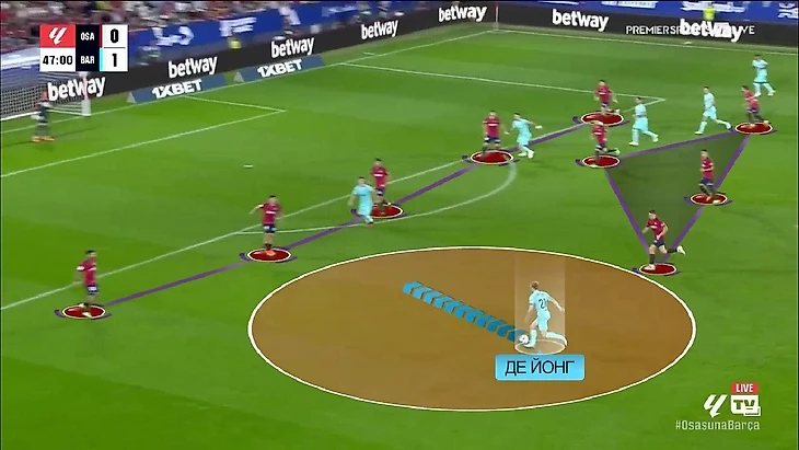 Понятное дело, что так происходило не на постоянной основе, однако это неплохо отражает приоритеты «Осасуны» в этом матче, и они, конечно, отличаются от рядовых матчей басков. Я не зря в начале текста отсылался к последнему очному матчу между «Барсой» и «Осасуной». Сходства на неоптимальном составе красных не заканчиваются – в тот раз баски тоже часто использовали ситуативную 5-6 человек в задней линии. У этого хода есть очевидный плюс – «Барселона» у которой впереди пять игроков при владении мячом, не имеет численного преимущества – ситуация 5-в-5 или вообще 5-в-6. Но и минусы у пяти-шести игроков сзади тоже очевидные – в других зонах недостаточно игроков. По сути, именно это и стало одним из немногих источников угрозы у ворот «Осасуны». А выгоды больше всего из этого извлёк Френки де Йонг.