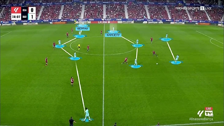 А вот более интересный вариант – Ферран уже располагается в широкой позиции, а Канселу смещается в центр и становится дополнительным полузащитником: