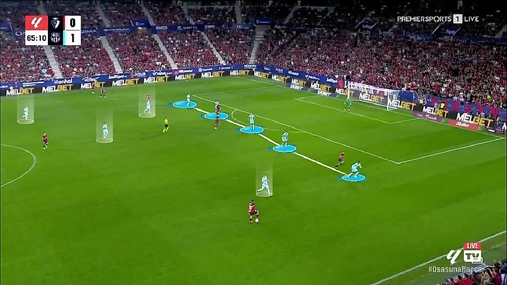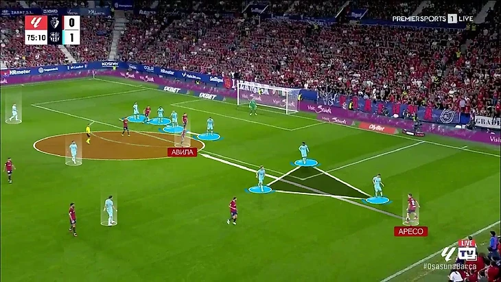 В моменте с голом Авилы эта проблема тоже ярко проявилась. Во-первых, здесь вообще нет никакой структуры. Во-вторых, сам принцип заполнения зон отсутствует – на фланг смещены сразу три игрока, при этом в опорной зоне только футболисты «Осасуны». Но самое интересное – даже этих трёх игроков не хватило, для того, чтобы перекрыть линию паса на Авилу в опорную зону: