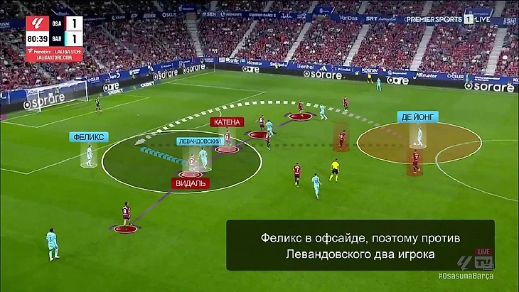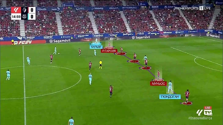 Если учесть, что Френки оказался на фланге из-за Рубена Гарсии, а Ромеу пошёл его страховать, то в опорную зону должен был сесть Гави, но он этого не сделал. Не сомневаюсь в самоотдаче Гави – это единичный эпизод, в котором он просто ошибся. Но «Осасуна» таким образом создала самый опасный момент в матче.