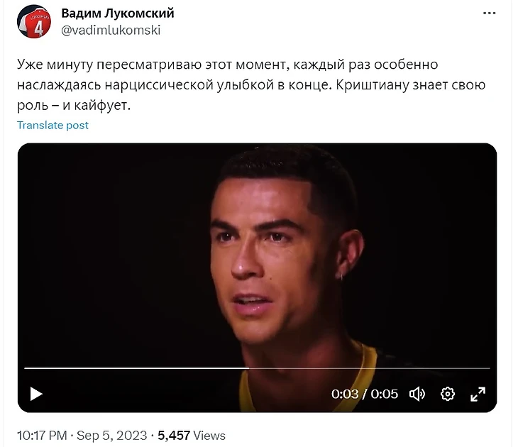 «Уже минуту пересматриваю этот момент». Реакция Вадима Лукомского на интервью Роналду – он заметил на видео 1 особенный момент