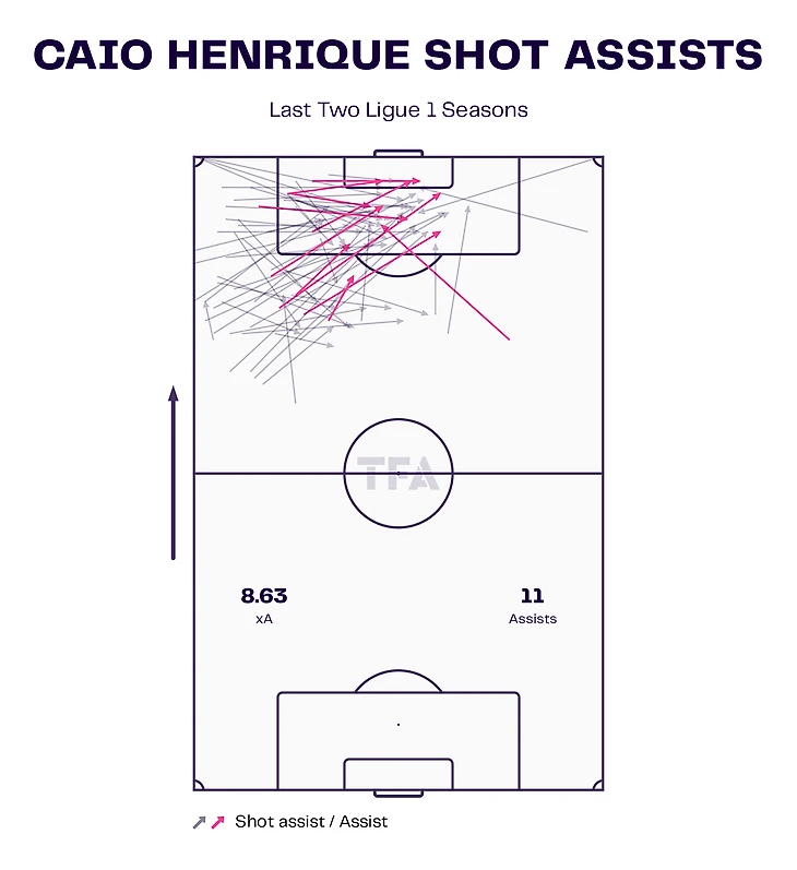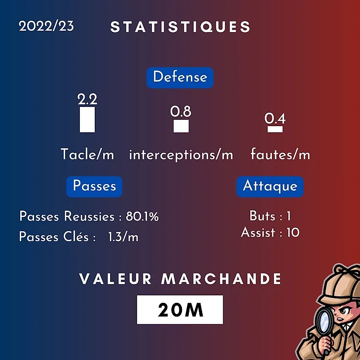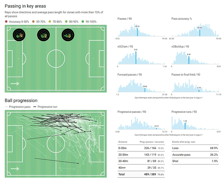 В Лиге 1 в прошлом сезоне он занимал высокие позиции по многим важным показателям-например первое место по результативным передачам (9) и восьмое место по прогрессивным передачам за 90 минут. (10,10), 14-е место по передачам под удар (1,31), 17-е место по глубоким забросам (0,90) и 20-е место по среднему количеству передач за игру (45,51).
