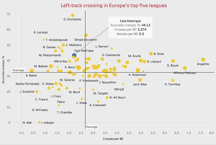 0,3 голевые передачи на 90 минут также являются одними из самых впечатляющих среди всех левых защитников в пятерке лучших лиг Европы в сезоне.
