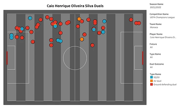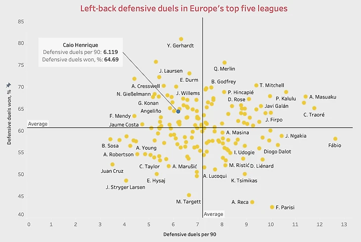 Взглянув на график ниже, мы видим, что хотя его 6,119 защитных дуэлей ниже среднего по выборке данных из топ-5 лиг, тем не менее, его процент побед в этих дуэлях (64,49%) очень высок и сам по себе превышает средний показатель для этой группы игроков.