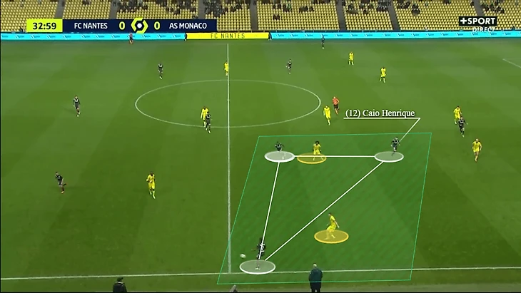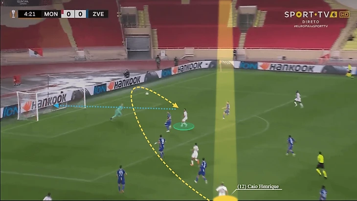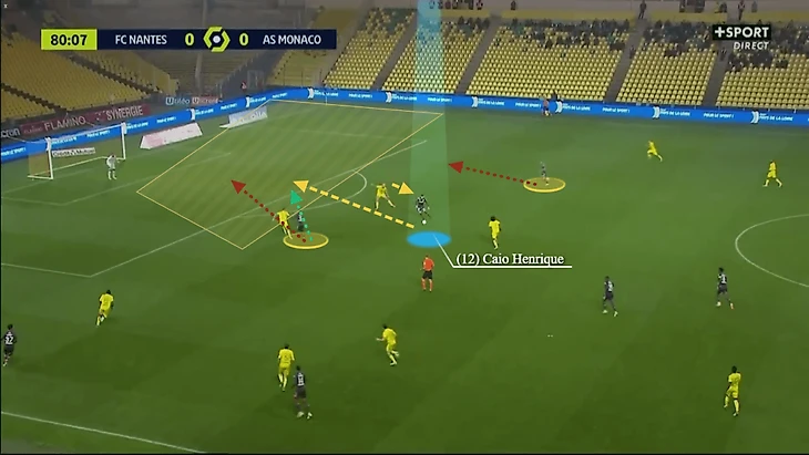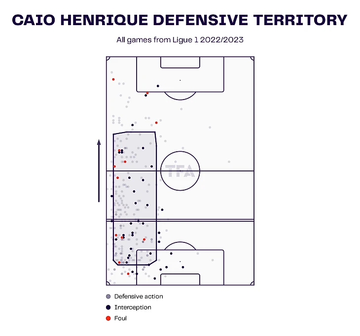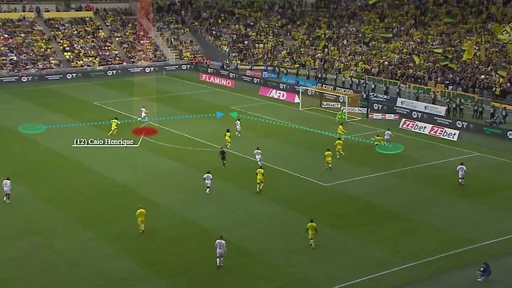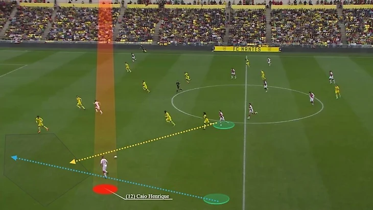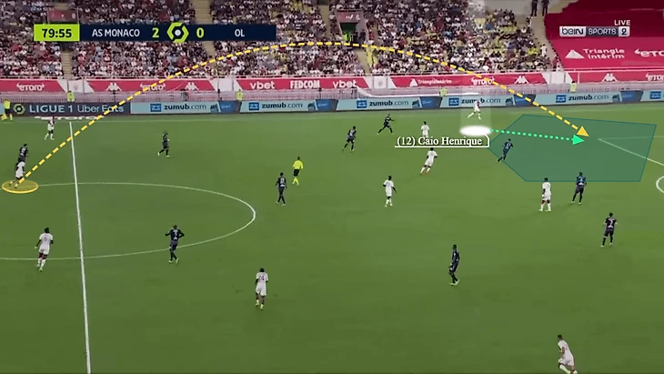 Что еще важно в переходах из атаки в оборону, Кайо хорош в контрпрессинге. Изначально находясь в широкой позиции, он грамотно выбирает время для сужения пространства и выхода в отбор, а если отбор не получается, не стесняется применять тактический фол.