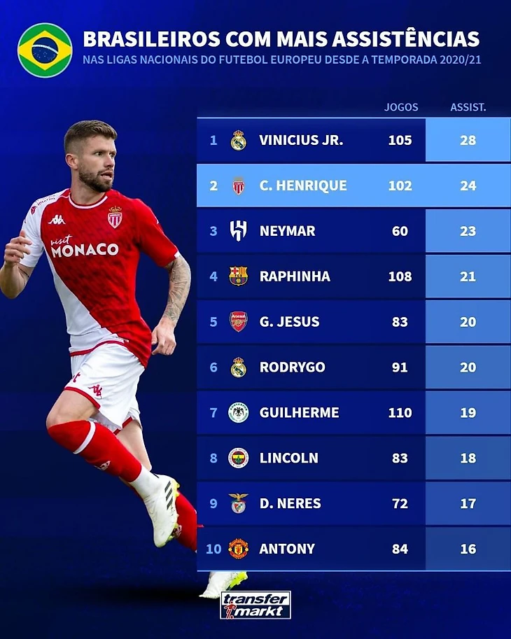 Более того, по итогам трех сезонов в Европе Кайо занимал второе место по количеству голевых передач среди бразильцев, уступая лишь Винисиусу и снова обойдя Неймара.