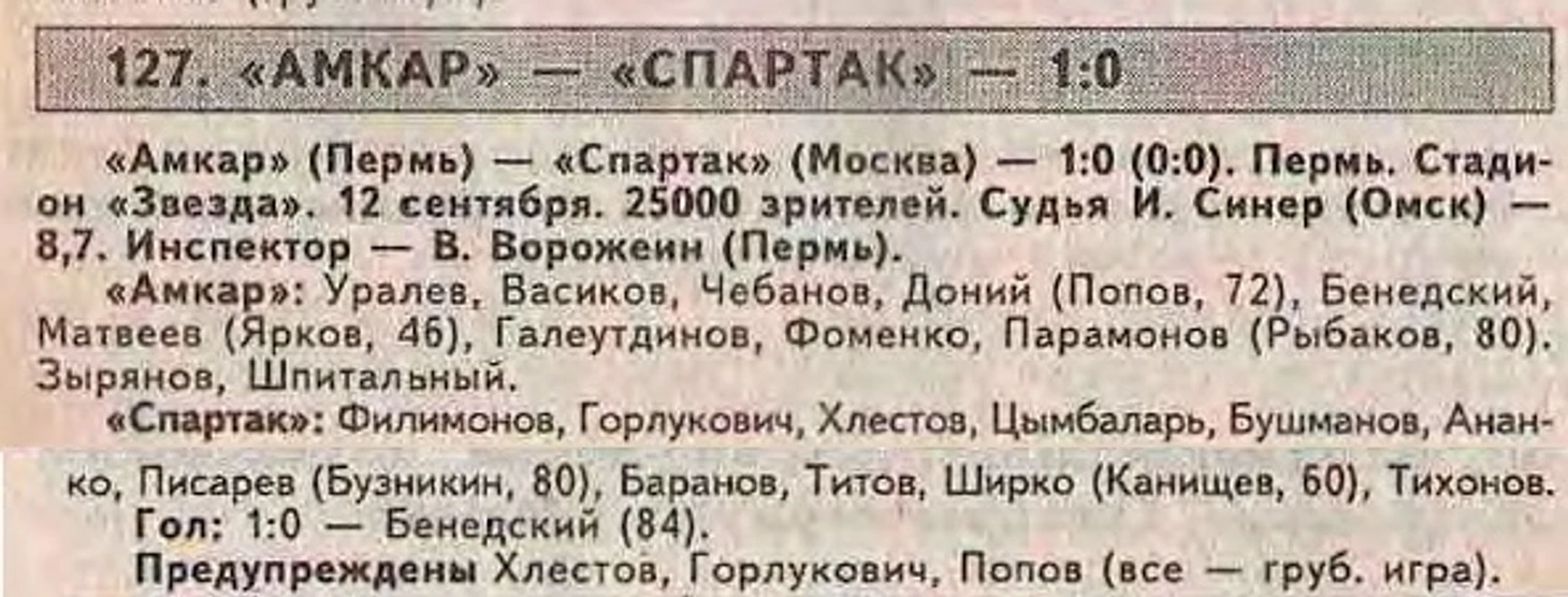 Кстати, за «Амкар» все 90 минут в том матче отборолся 20-летний Константин Зырянов. О его дальнейшей футбольной судьбе известно всем, а вот спортивное будущее главного героя матча, автора исторического гола Владимира Бенедского, не сложилось.