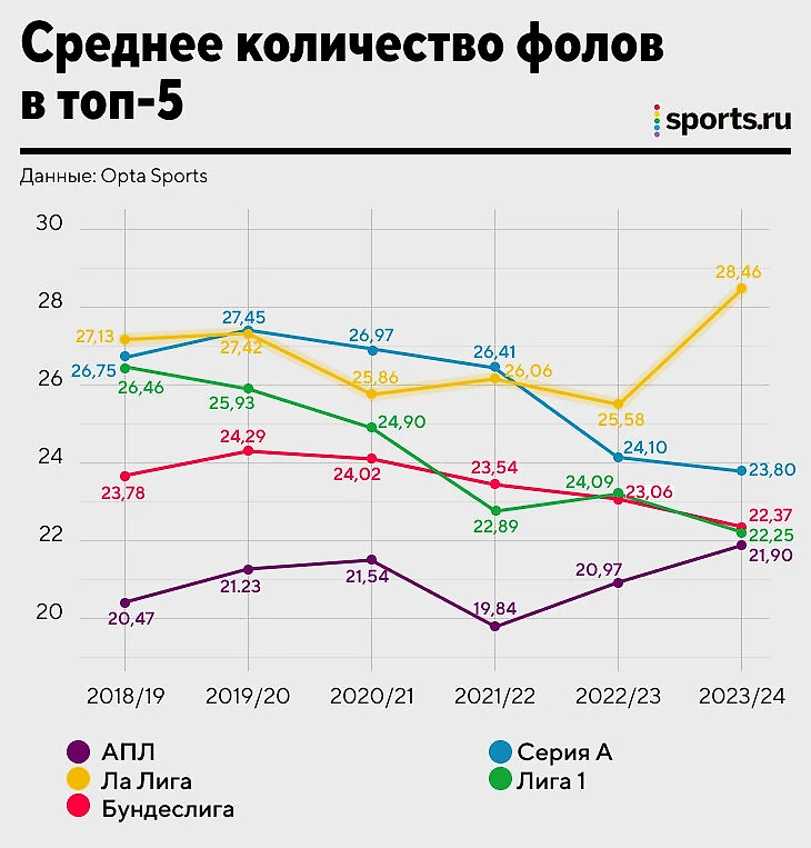 По среднему количеству фолов Ла Лига в топ-2 вместе с Серией А и с отрывом лидер стартовавшего сезона: