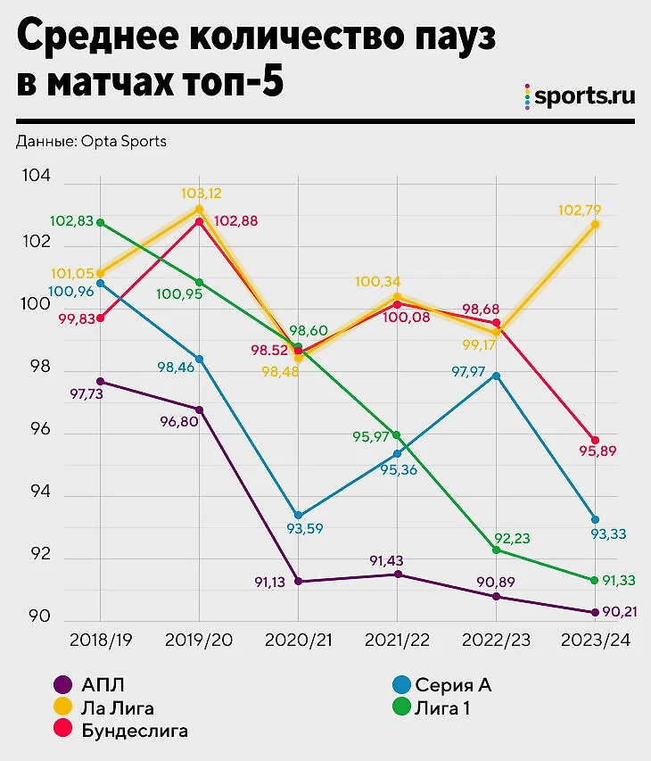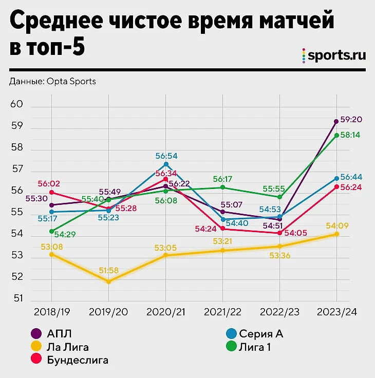 Особенно парадоксальная ситуация сложилась на старте этого сезона. Из-за судейских инструкций по компенсированному времени в Ла Лиге самые продолжительные матчи по общему хронометражу (102:44), но даже это не помогает подняться с уверенного последнего места по чистому времени (54:09). То есть причина именно в количестве пауз и умении команд их растягивать (дозволенности растягивать?).