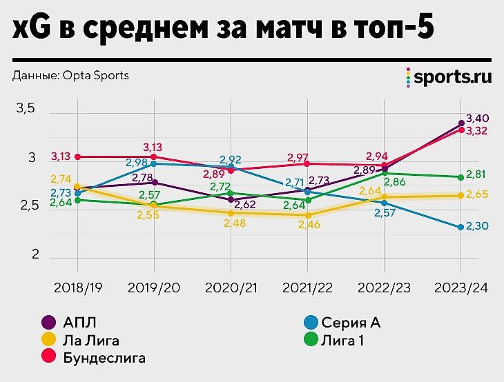 Голы – самый важный, но слишком примитивный способ оценивать характер лиги. Как там с острыми моментами? Проверим через средний показатель xG: