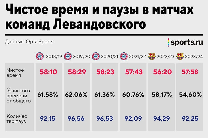Во-первых, фиксируем, что матчи «Барсы» лучше в плане чистого времени и пауз, чем в среднем по Ла Лиге. Во-вторых, кардинальной разницы в количестве пауз и чистом времени относительно времени в «Баварии» нет. Результаты старта этого сезона (когда Роберт не выдержал и высказался) даже лучше, чем в отдельные немецкие годы.