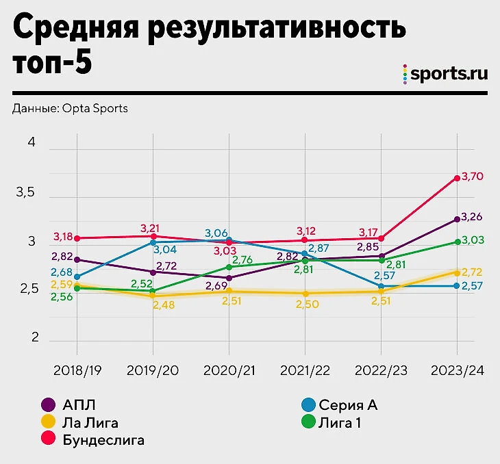 Еще один важный фактор: из-за опоры на личный опыт Роберт сравнивает Ла Лигу в первую очередь с Бундеслигой. Там обратная картина: в 4 из 5 сезонов немецкая лига была самой результативной (плюс одно 2-е место).