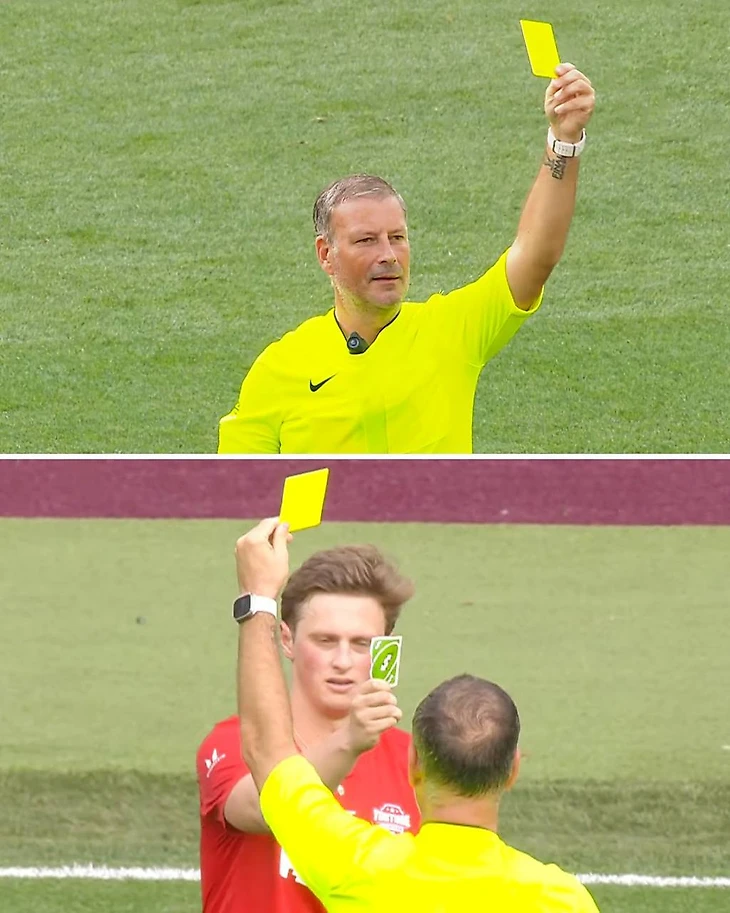 В игре Sidemen FC с с YouTube All-Stars звездый судья Марк Клаттенбург показал желтую футболисту ютуб-звезд, а он направил ее обратно арбитру – карточкой-перевертышем из игры Uno!