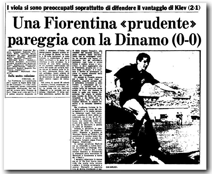 Это строки из песни Владимира Высоцкого "Разговор с женой после чемпионата мира по футболу" (на ЧМ 1970 Бышовец забил четыре из шести голов сборной СССР, оформив дубли в матчах с командами из Бельгии и Сальвадора). Дело в том, что в 1969 году киевляне впервые встретились в еврокубках с "Фиорентиной". Жребий свел команды в 1/8 финала Кубка Чемпионов. В первом матче итальянский клуб выиграл в Киеве 2-1. На голы Лучано Кьяруджи (36-ая минута) и Марио Мараски (69-ая) киевляне ответили на 57-ой, когда мяч в ворота гостей из Флоренции отправил Виктор Серебрянников. Ответная игра завершилась нулевой ничьей, что позволило "Фиорентине" пройти в четвертьфинал турнира. Есть версия, что во время приема в Киеве итальянцы заявили, что им хотелось бы заполучить Бышовца в состав "Фиорентины".
