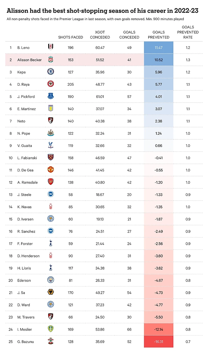 Его показатель предотвращенных голов также является самым высоким, что говорит о том, что в среднем для того, чтобы он пропустил гол, соперник должен генерировать около 1,3 xGOT.