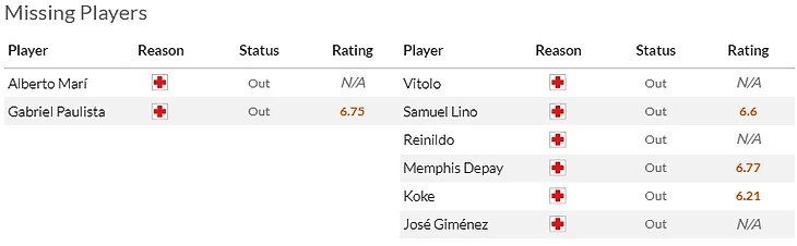 Что касается более близких перспектив, то в сборных синхронно травмировались Чаглар Сеюнджю(6) и Родриго Де Поль(7,5), зато в общей группе снова тренируется Хосе Хименес(6,5). А вот защитники Валенсии Габриэл Паулиста (5,5) и Димитри Фулькье(5,5) и без всяких сборных организовали себе травмы и на поле не появятся.