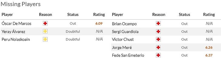 На что обратить внимание: На Вирус ФИФА. Который особенно легко поражает молодые, неокрепшие футбольные организмы. Стоило только Нико Уильямсу(7,5) сгонять в расположение Красной Фурии – как вингера настигли мышечные травмы из за которых он теперь пропустит несколько недель. Зато вернулись в общую группу Йерай Альварес(5,5) и Оскар Де Маркос(6).