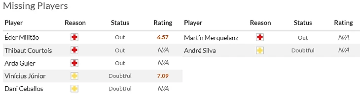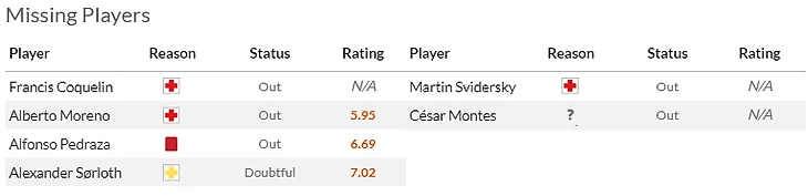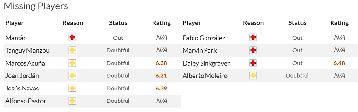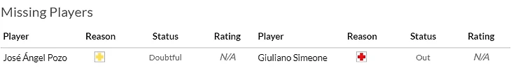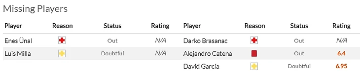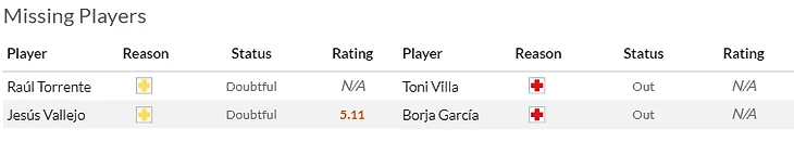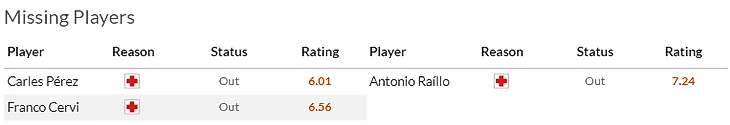 А вот у гостей нарисовались проблемы в обороне: забанен основной центральный защитник Катена(5,5) и не совсем здоров его основной сменщик Унай Гарсия(5,5), плюс травмирован многофункциональный Хон Монкайола(6,5).