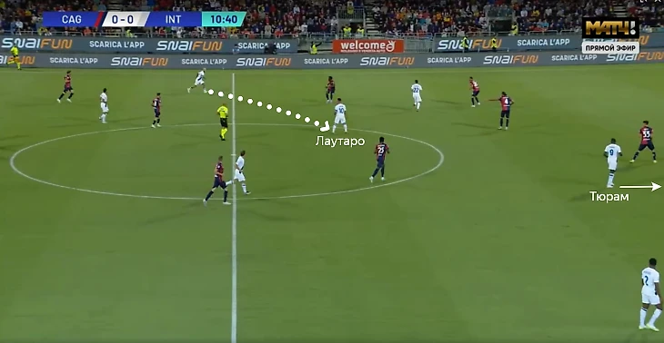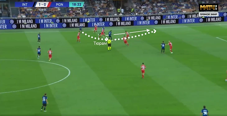 Первые ростки уже заметны. Лаутаро оценивает ситуацию и действует в зависимости от движения Тюрама. Здесь он открылся ниже и пытался использовать рывок француза (но неточно отдал).