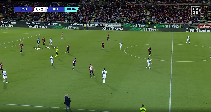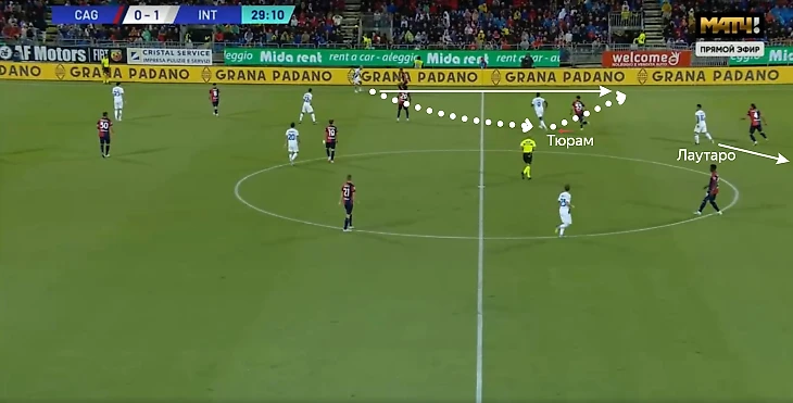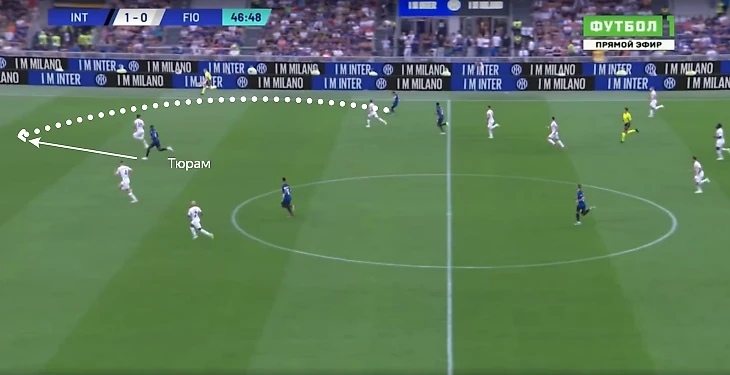 Тюрам часто уходит и на фланги. Это важно для системы «Интера», ведь тогда активные вингбеки получают дополнительную поддержку не только от ближней восьмерки.