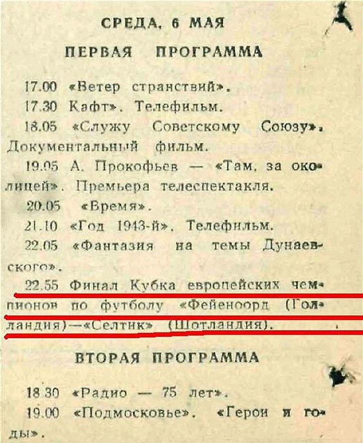 «На самом деле, советское телевидение время от времени транслировало матчи иностранных клубов и сборных, – вспоминает Александр Елагин. – Но это были матчи, где хотя бы одна из команд представляла страну социалистического лагеря [Первым таким стал матч первого круга Кубка европейских чемпионов 1958/59 годов между «Висмутом» из ГДР и румынским «Петролулом». По итогам двух встреч зафиксирована ничья и в соответствии с регламаментом назначена переигровка на нейтральном поле. Игра, завершившаяся 4:0 в пользу «Висмута», прошла в Киеве и была показана по украинскому телевидению. Во времена СССР у каждой союзной республики имелись собственные каналы телевидения, вещание на которых велось на национальных языках – Sports.ru]. При этом телевидение могло совсем проигнорировать крупные турниры, на которые сборная СССР не отобралась. По этой причине не было трансляций финального турнира Евро 1976 и 1980 годов – только радиорепортажи. На Евро-1984, куда сборная СССР тоже не попала, по телевидению показали только полуфиналы и финал. И это уже был большой шаг вперед. Поэтому финальный матч КЕЧ-1970 между «Фейеноордом» и «Селтиком» стоит особняком – сам факт трансляции был удивительным и неожиданным, настоящим подарком для советских любителей футбола».