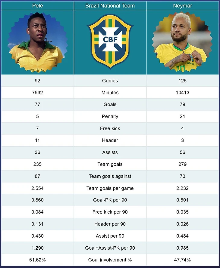 Да, если кому-то хочется сравнить с Месси. Получим у аргентинца 37 голевых действий (добавим 4+3 в 2010 и 10+3 в 2014). 37 у Месси за карьеру против 34 у Неймара. В 57 матчах против 24.