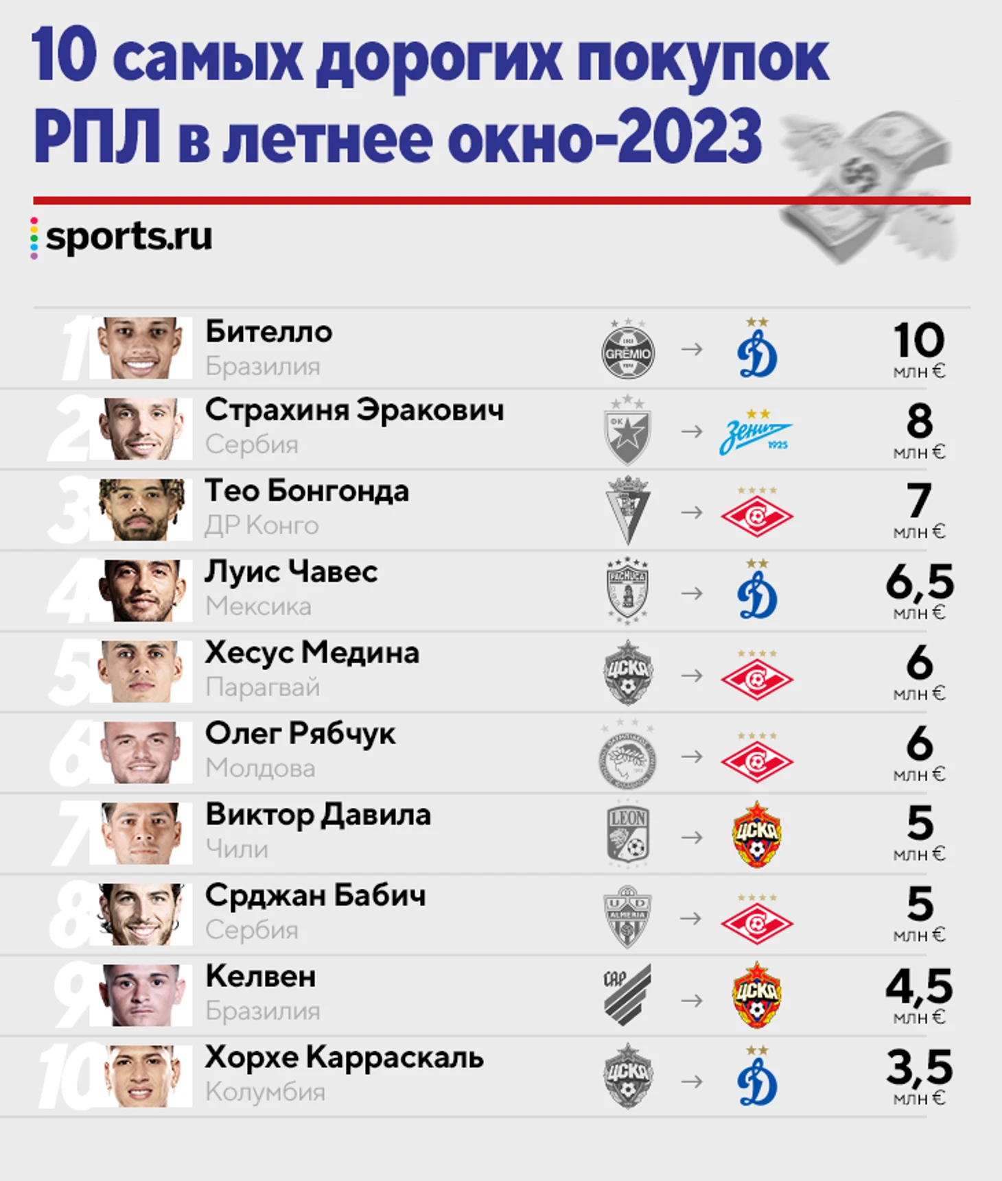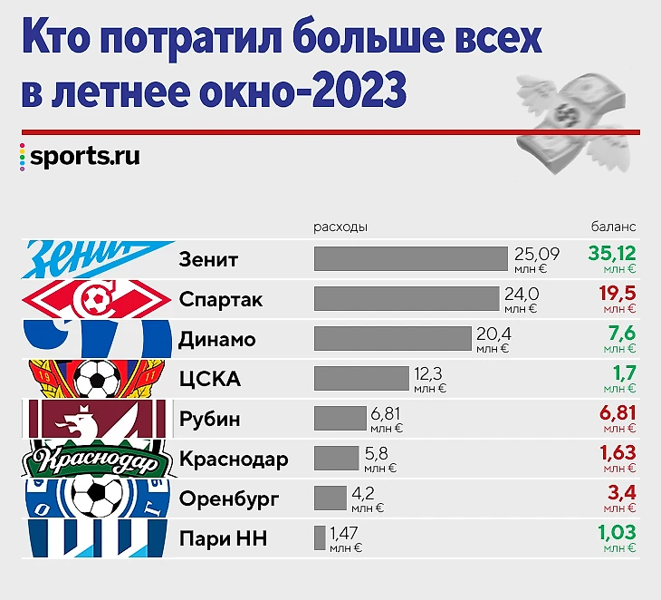 ● Также в тройке «Спартак» и «Динамо»– каждый клуб потратил больше 20 млн евро. Отрицательный баланс во всей топ-3 только у «Спартака».