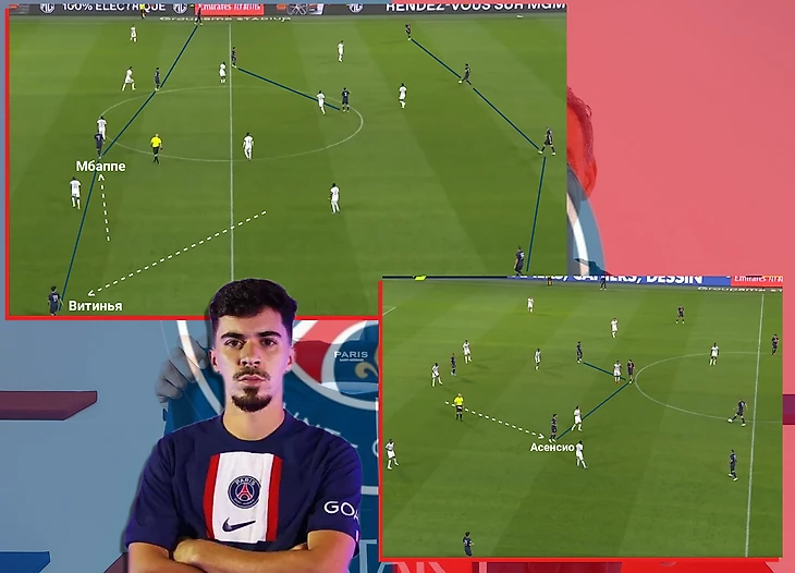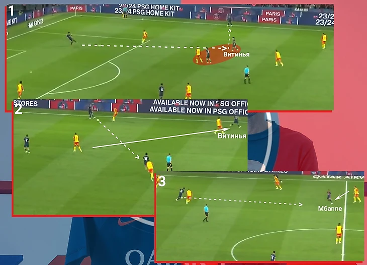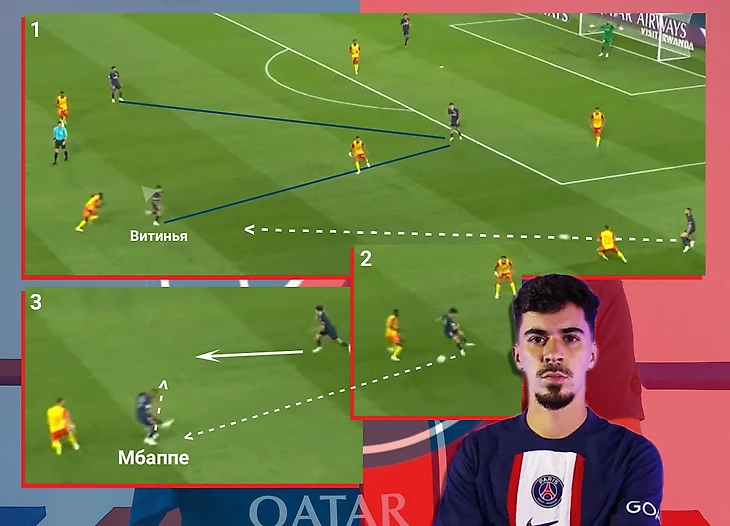 После сбора информации португалец в одно касание отдает пас внешней стороной стопы на Мбаппе, затем, развернувшись через левое плечо, открывается под обратную передачу. В этой атаке Витинья отдаст предголевую передачу. Продолжение разборок Витиньи с соперником сзади в телеграм-канале
