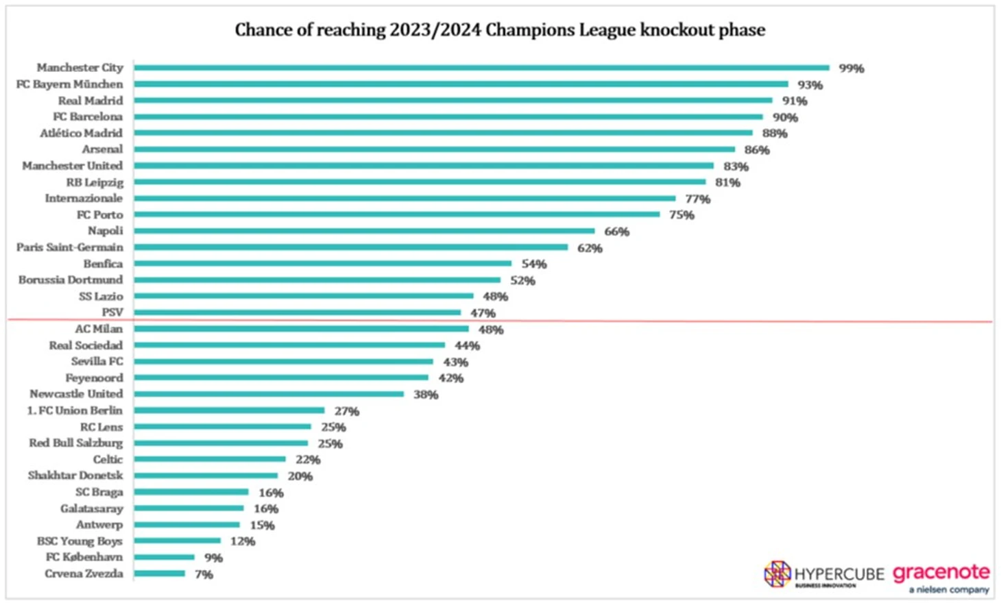 По мнению суперкомпьютера, у восьми команд есть крайне высокие шансы на выход в плей-офф Лиги чемпионов − шести с первого места и двух со второго. Причем у «Манчестер Сити» этот процент составляет 99% − бездушная железяка уверена, что никаких проблем у действующего победителя ЛЧ с «Лейпцигом», «Црвеной Звездой» и «Янг Бойз» не будет. Букмекеры согласны с прогнозом, называя команду Гвардиолы главным фаворитом на победу.