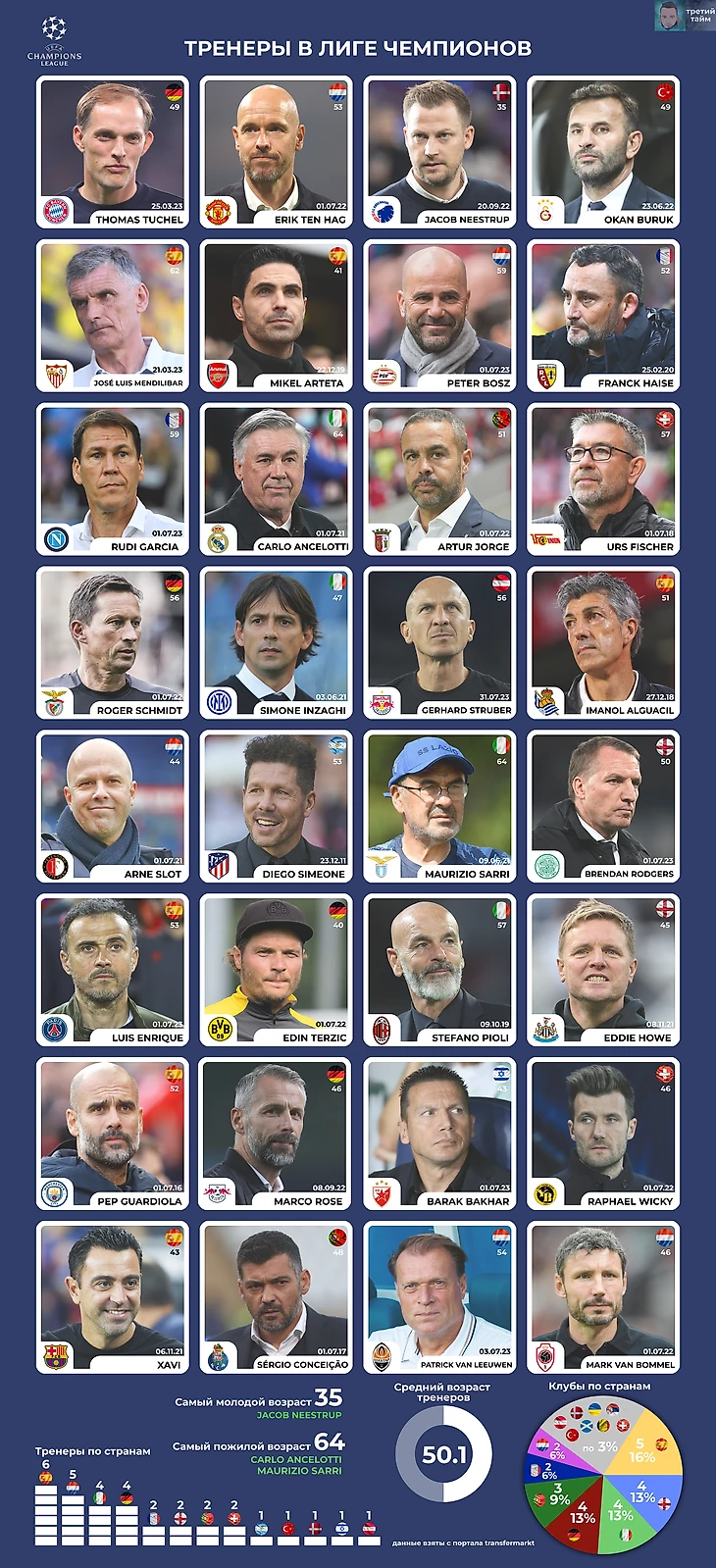 Сразу обратим внимание, что в розыгрыше Лиги Чемпионов 2023/24 будут выступать клубы из 15 стран. А тренеры представляют 13 стран.