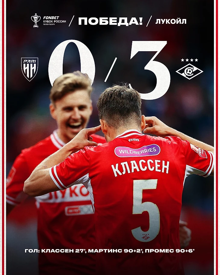 Спартаковцы одержали четыре победы в четырех кубковых матчах. Стопроцентный показатель, благодаря которому красно-белые уже обеспечили себе выход из группы D с первого места. Отметим, что за игрой в Нижнем Новгороде наблюдали генеральный директор нашего клуба Олег Малышев и спортивный директор Пол Эшуорт.