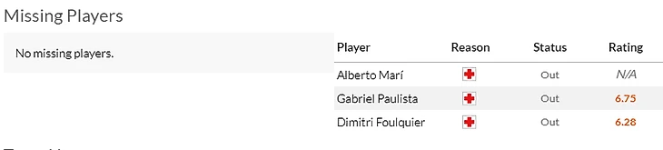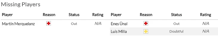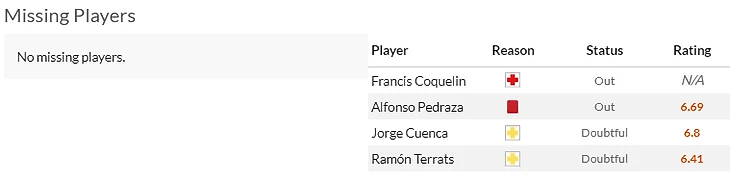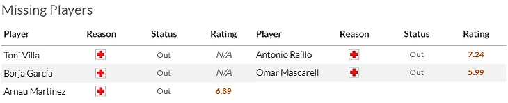 Хотя на самом деле конечно же можно. Тренер хозяев наверняка бы не отказался в ближайшем туре от услуг Молейро(6,5) и Рамиреса(6,5), но к сожалению для него оба юнита недоступны из-за травм. А вот гостям из Гранады придется до последнего с тревогой ждать новостей о состоянии здоровья Рубио(5), Узуни(7,5) и Вальехо(5,5).