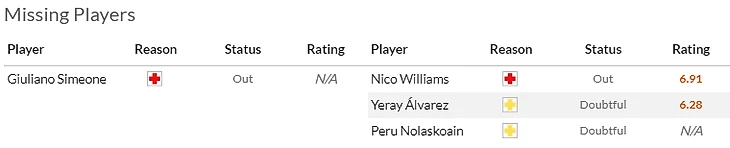 Глядя на такие спецэффекты никому не хочется сидеть в лазарете, так что в общую группу еще на прошлой неделе вернулся Йерай Альварес(5,5), который может выйти на поле уже сегодня. А вот хозяева наоборот внезапно лишились приболевшего Бланко(6).