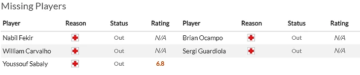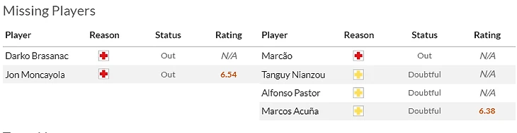 Но это все светлое будущее, а в суровом настоящем Севилья продолжает барахтаться в зоне вылета и считать дни до возвращения в игру Маркоса Акуньи(6,5). До которого вроде бы осталось совсем недолго, но этот тур латераль пропустит вместе с Ньянзу(5,5) и Маркао(5,5). Что касается гостей, то они пока не планируют заниматься строительством, но вынуждены обходиться без травмированных Монкайолы(6,5) и Уная Гарсии(5,5).