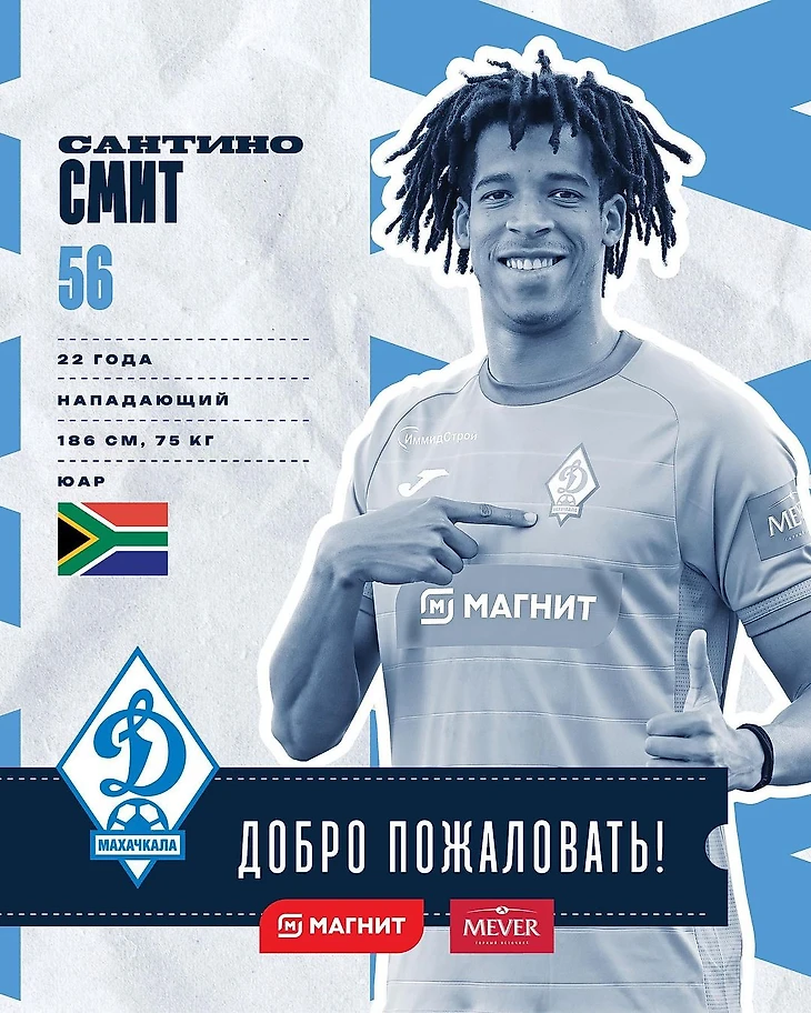 «Динамо» Махачкала подписало контракт с 22 летним футболистом из ЮАР Сантино Смитом