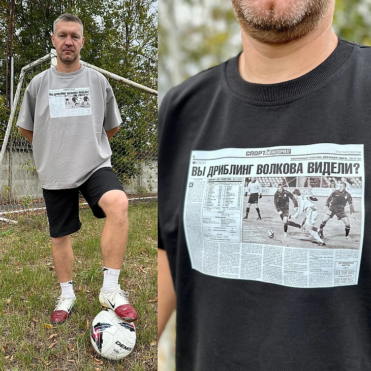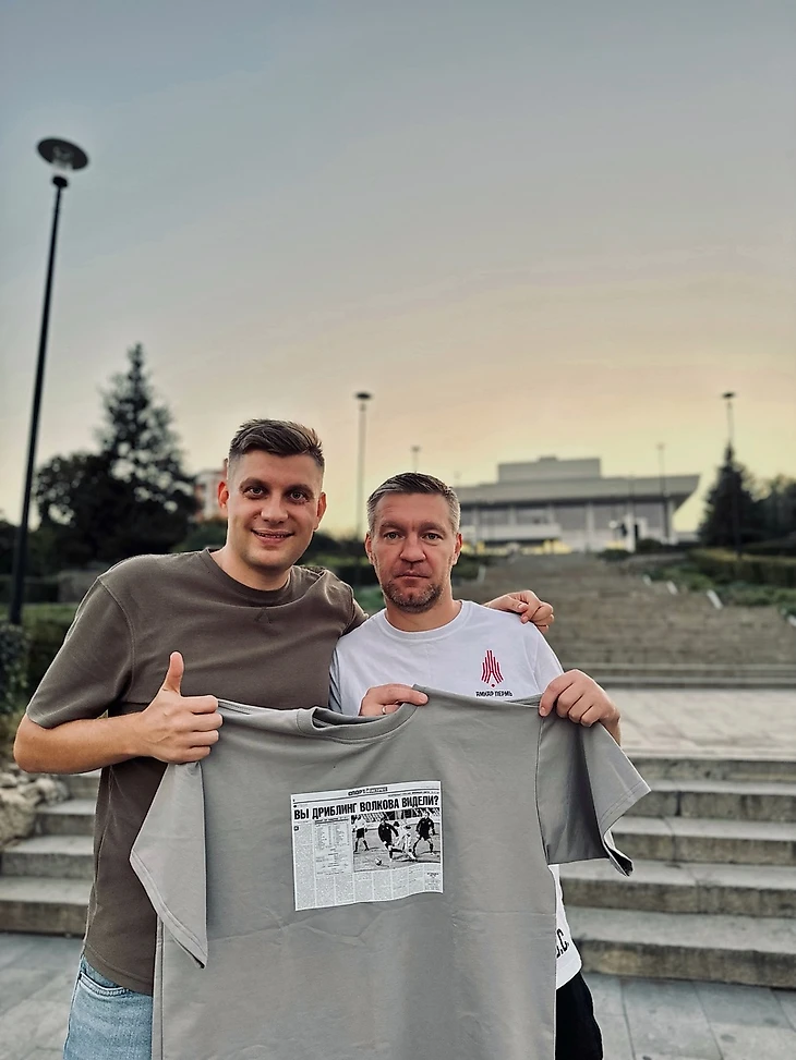 В руках мы держим свежейший мерч пермяков и бренда одежды «Не для всех», которые выпустили (для всех) совместную коллекцию, посвященную фанатам. На джерси — первая полоса газеты «Спорт-Экспресс» от 18 октября 2004 года с заголовком «Вы дриблинг Волкова видели?»