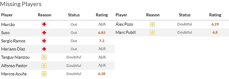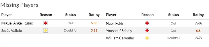 Что касается хозяев, то тут по прежнему лечатся Фулькье(5,5) с Хесусом Васкесом(5) , зато готов дебютировать в Ла Лиге Яремчук(7)и вернулся в общую группу Габриэл(5,5).