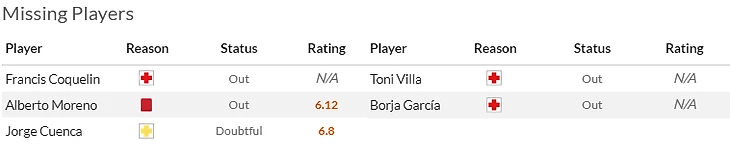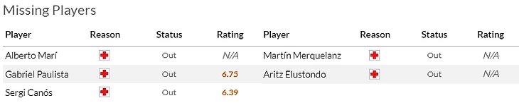 Что касается гостей, то тут совершенно некстати заработал дисквал основной центральный защитник Мармоль(5) и по прежнему кукует в лазарете ударный форвард Сандро Рамирес(7).